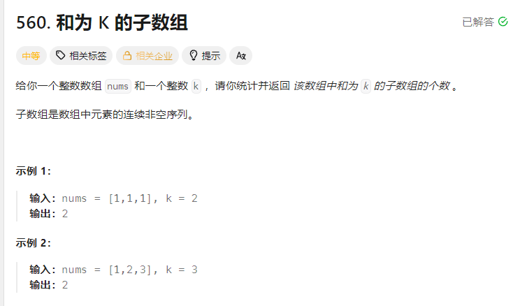 # 如果前缀和 sum - k 在哈希表中出现过, 那么从某个位置到当前位置的子数组和为 k
