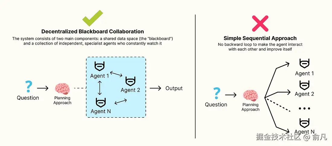 - 代理不按固定顺序触发,而是当黑板状态与其专业领域匹配时,会被自行激活。