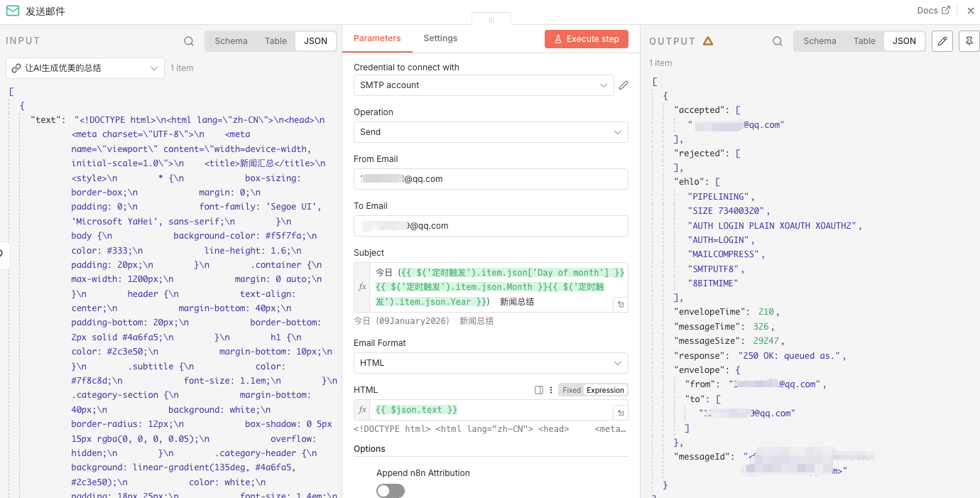 邮件的subject:今日({{ ('定时触发').item.json\['Day of month'\] }}{{ ('定时触发').item.json.Month }}{{ $('定时触发').item.json.Year }}) 新闻总结