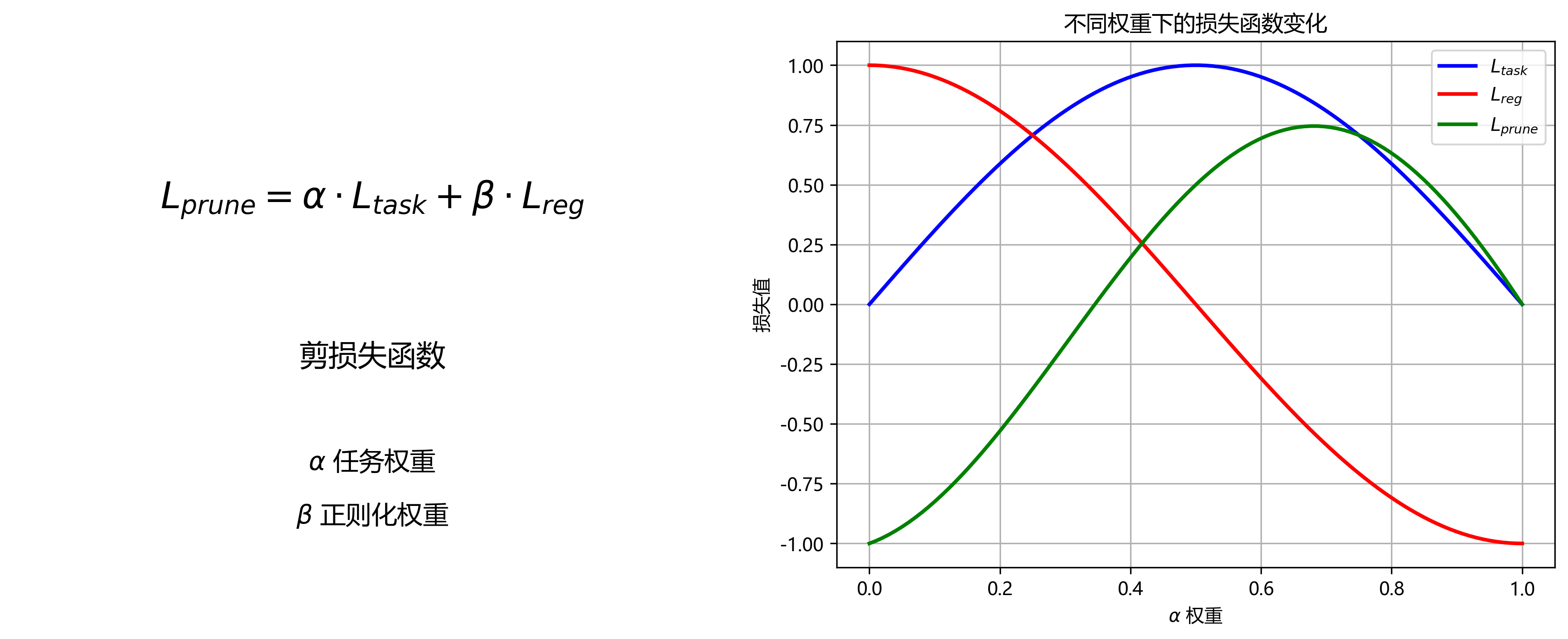 Lprune=α⋅Ltask+β⋅LregL_{prune} = \alpha \cdot L_{task} + \beta \cdot L_{reg}Lprune=α⋅Ltask+β⋅Lreg