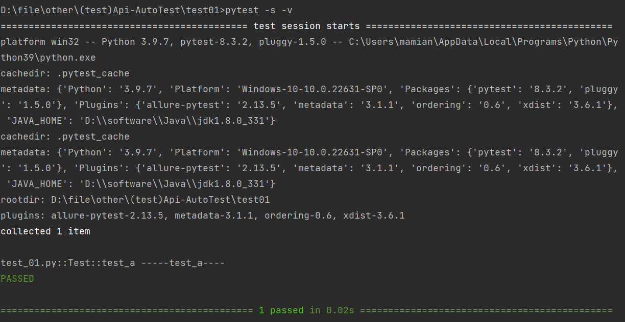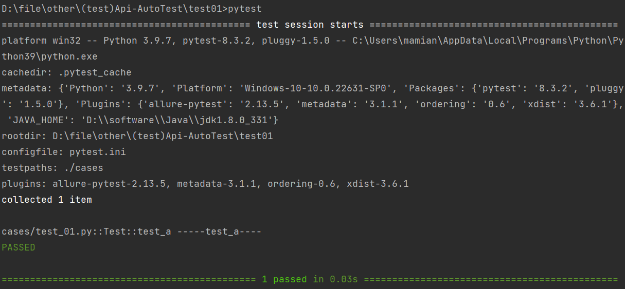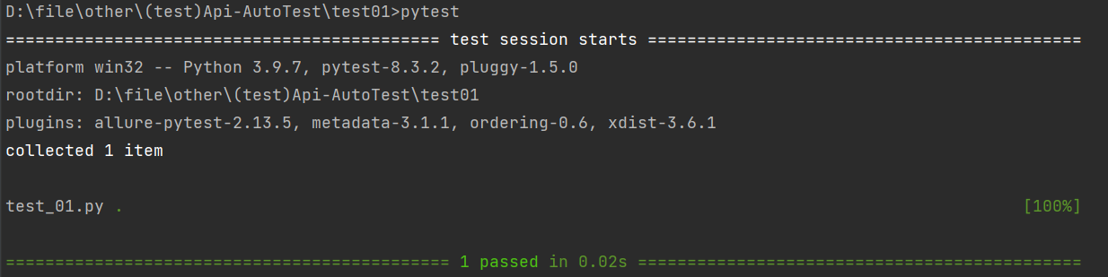 配置好 pytest.ini ⽂件后,命令⾏执⾏ pytest 命令即可,⽆需再额外指定其他参数: