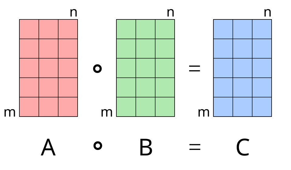 For two matrices A \mathbf {A} A and B \mathbf {B} B of the same dimension m × n m \times n m×n, the Hadamard product A ⊙ B \mathbf {A} \odot \mathbf {B} A⊙B (sometimes A ∘ B \mathbf {A} \circ \mathbf {B} A∘B) is a matrix of the same dimension as the operands, with elements given by