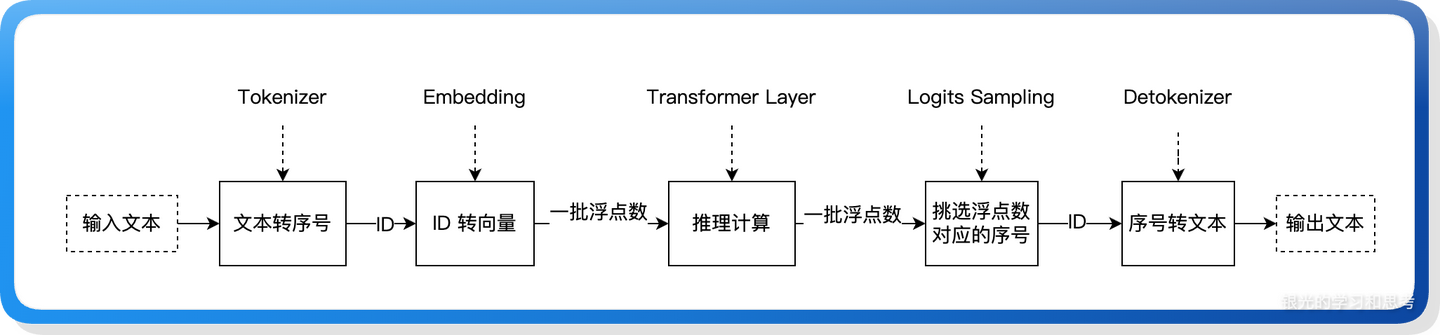 大模型推理的最简流程可以概括为:输入一串文本 → 文本通过词典映射表转换成一串数字序号 → 序号再经过 embedding 层的计算,变成一组能代表语义的浮点数向量 → 这组向量送入推理系统,经过层层的矩阵乘法、加法和各类专用函数的运算,得到新的输出向量 → 对输出向量做概率筛选,选出概率最高的那个数值对应的序号 → 最后再通过词典映射表 "翻译" 回文字,得到最终输出的一个词。