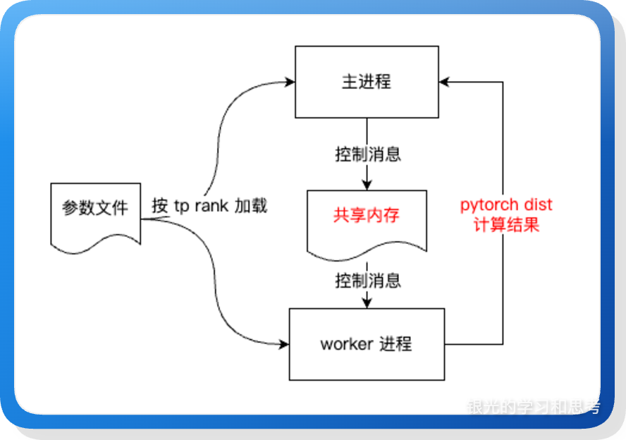 (1)进程隔离与独立加载: 采用多进程模式,一个 GPU 对应一个独立进程。各进程并发读取权重文件,并根据自己的 tp_rank 按照预设的切分策略(如 ColumnParallel 的行切分或 RowParallel 的列切分),将属于自己的那部分数据从 safetensors 加载到显存中。