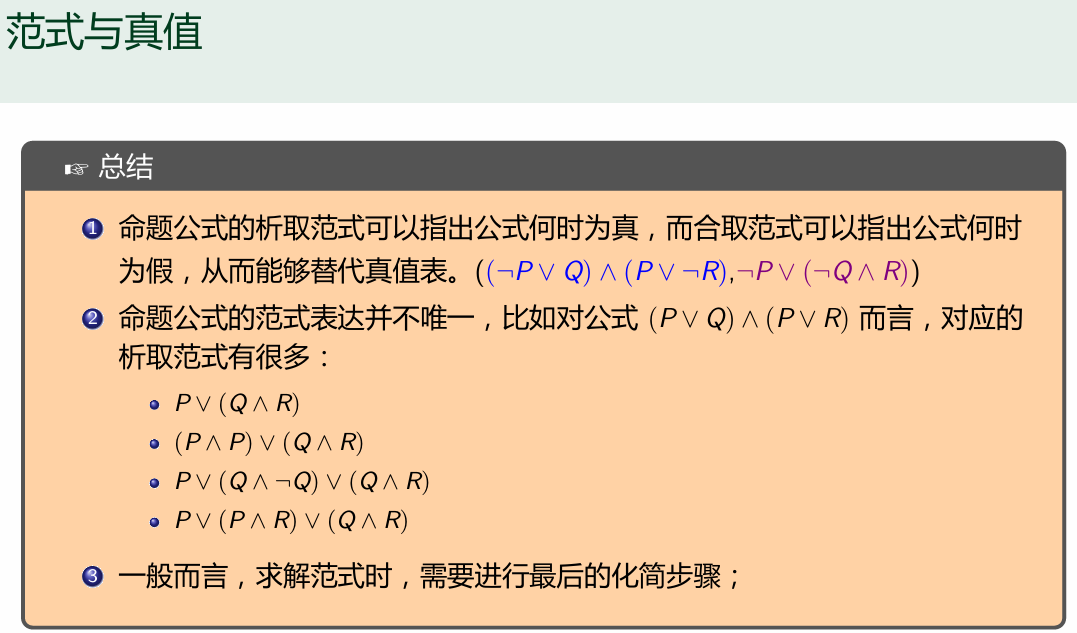 - 其实通过上面的学习 我们还是没有真正领悟范式的精髓作用所在 它之所以能够替代真值表 那么它一定能够指出公式何时为真或为假