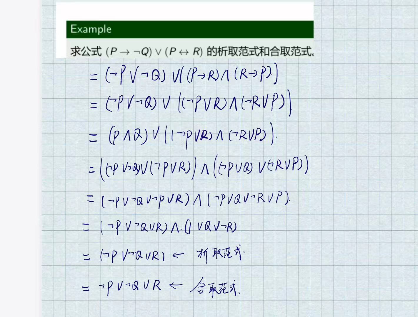 - 由于析取以及合取范式里面是不存在蕴含以及等价联结词的 所以我们就需要通过前面的公式进行转化 这是非常关键的