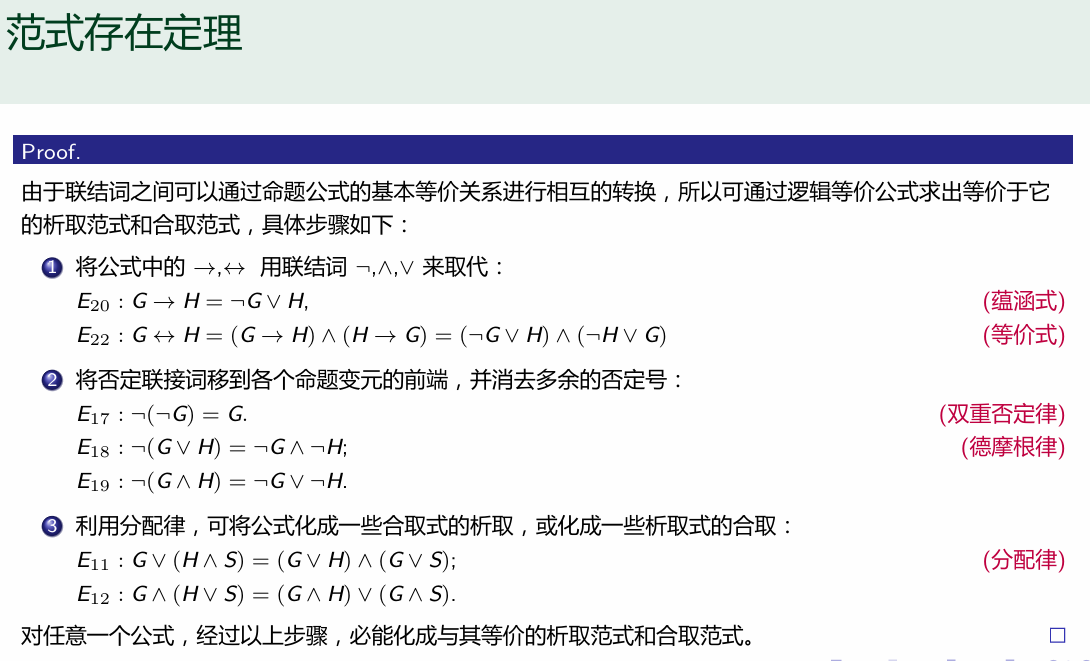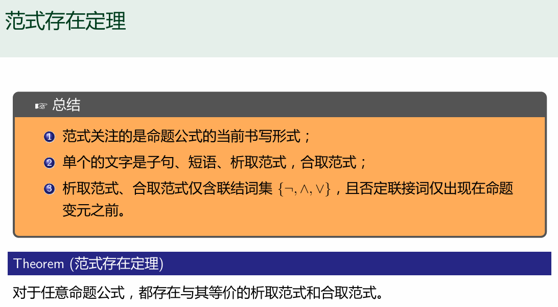 - 由于对于任意的命题公式都存在与其等价的析取范式以及合取范式 那么我们