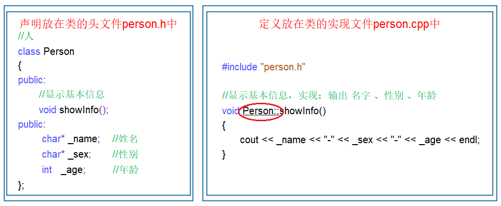 2.类的声明放在.h文件中,成员函数定义放在.cpp文件中。不过需要注意的是,成员函数名前需要加类名。