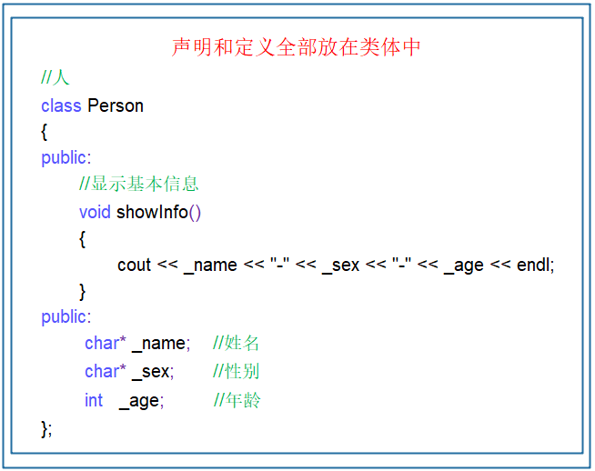 1.声明和定义全部放在类体中。不过需要注意的是,如果类的成员函数直接在类里面定义,会默认为内联函数。