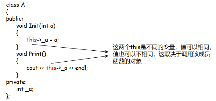 7.不同成员函数内的this是不同的变量,因为this在不同成员函数内都是作为形参的存在,当同一个对象调用不同成员变量时,那么成员变量内的this指针的值就一样,不同对象调用不同的成员函数时,this指针的值就不一样,this指针指向调用成员函数的对象,是该对象的地址。