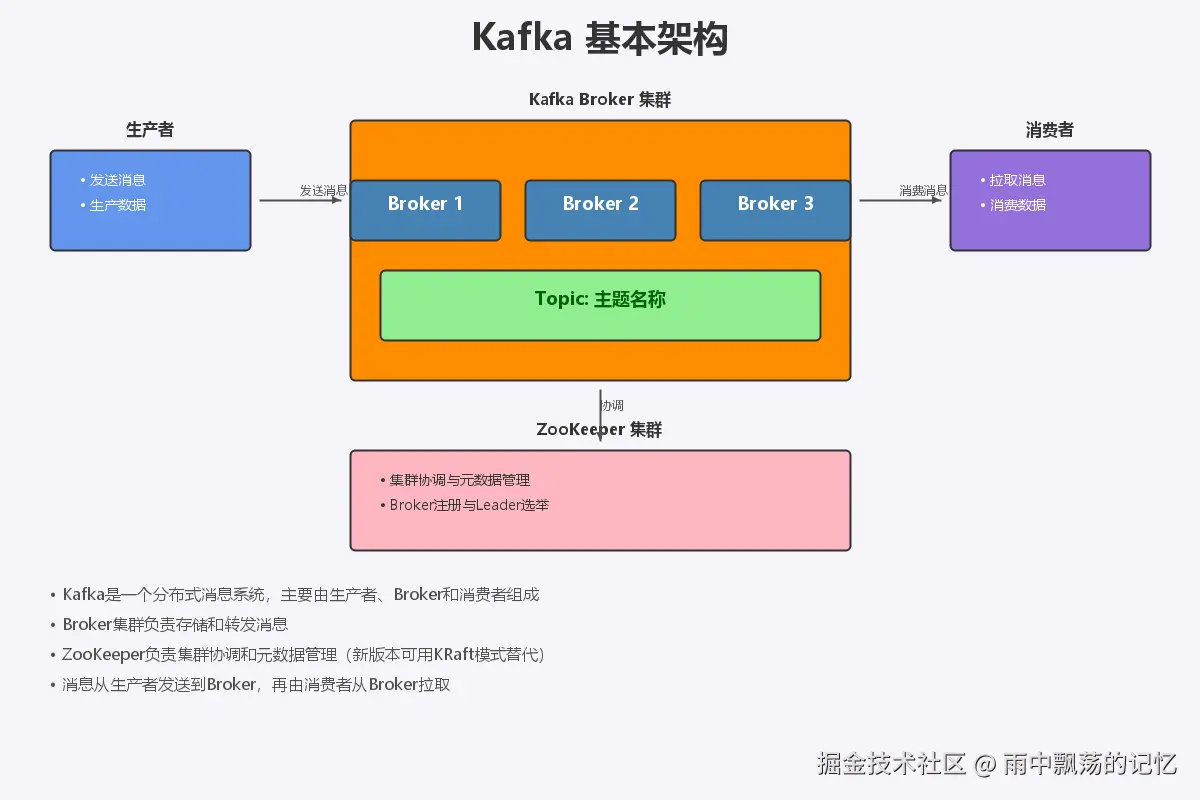 Kafka集群由多个Broker组成,生产者(Producer)向Kafka发送消息,消费者(Consumer)从Kafka消费消息。以下是Kafka的基本架构: