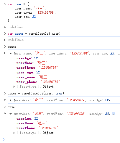 接收两个参数:第一个参数是要转换的对象,第二个参数表示是否只要转换后的驼峰格式的对象,如果为 true 的话,将返回新对象,并且只包含驼峰格式的字段,如果为 false 那么将改变原对象,保留原对象的属性,然后增加转换后的属性