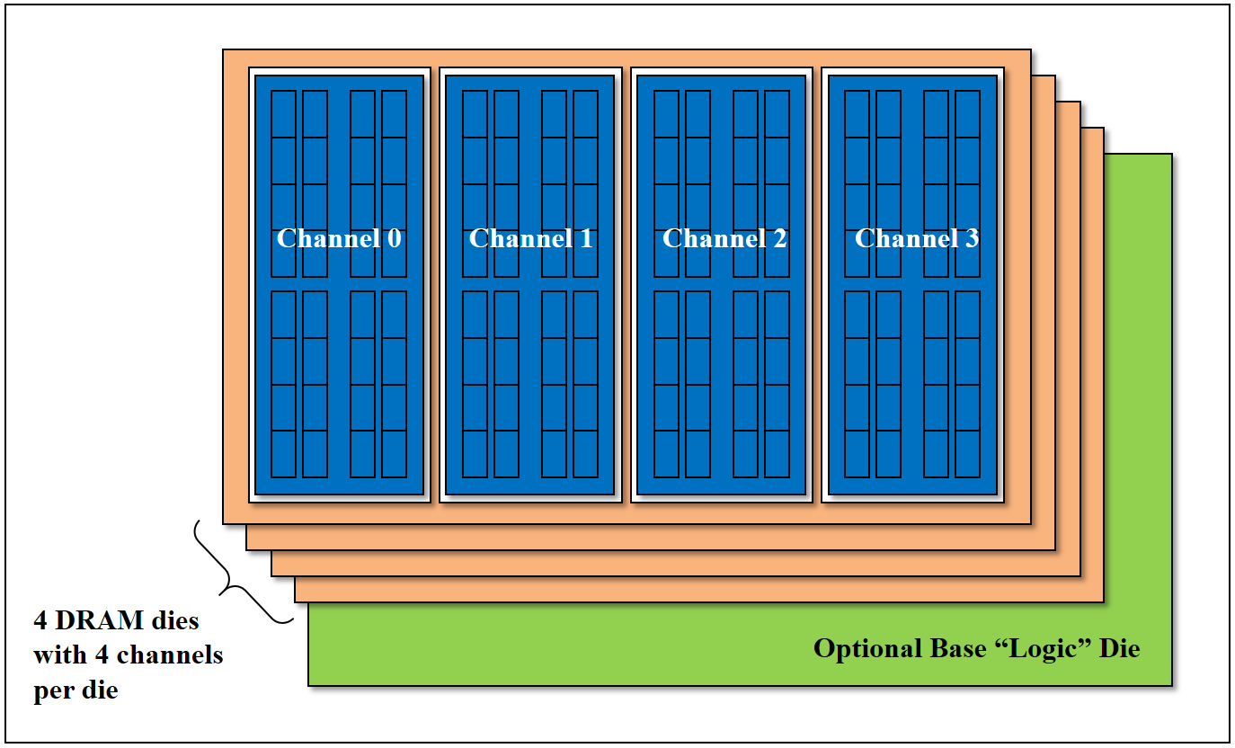DRAM 裸片层:共 4 层 DRAM 裸片,每层裸片内置 2 个独立内存通道(如示意图中的 Channel 0、Channel 1);