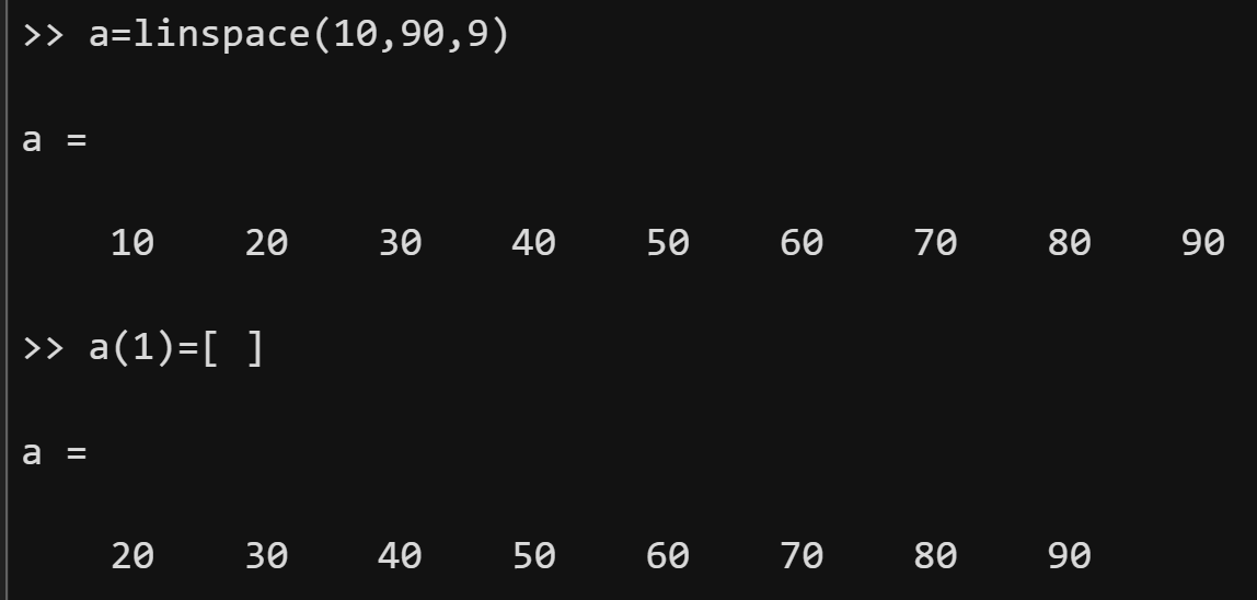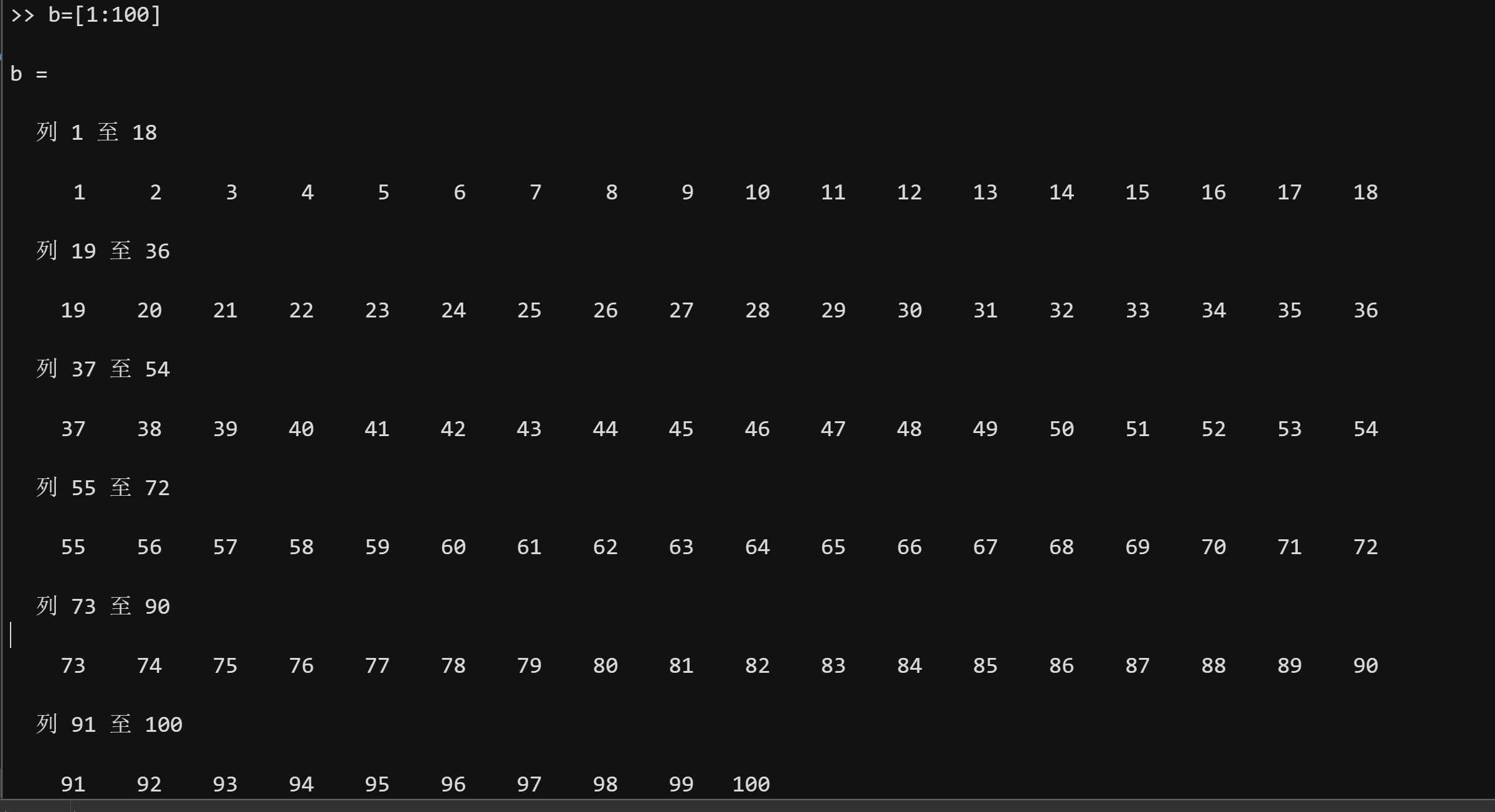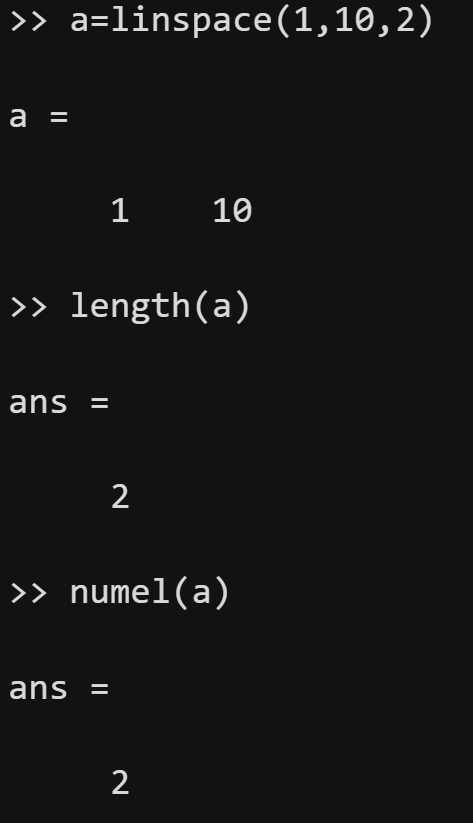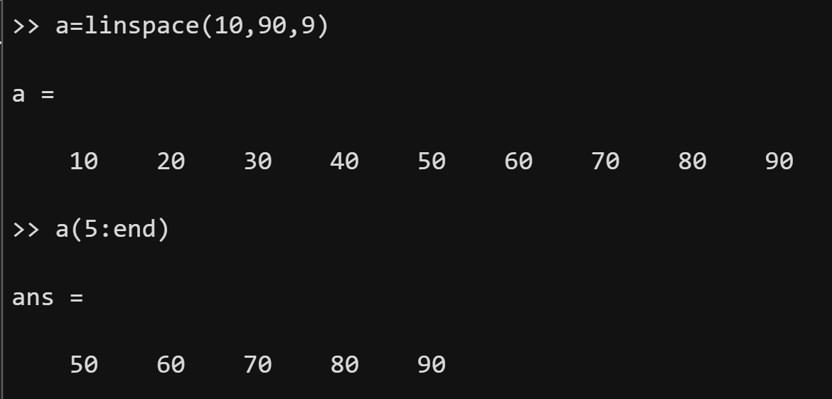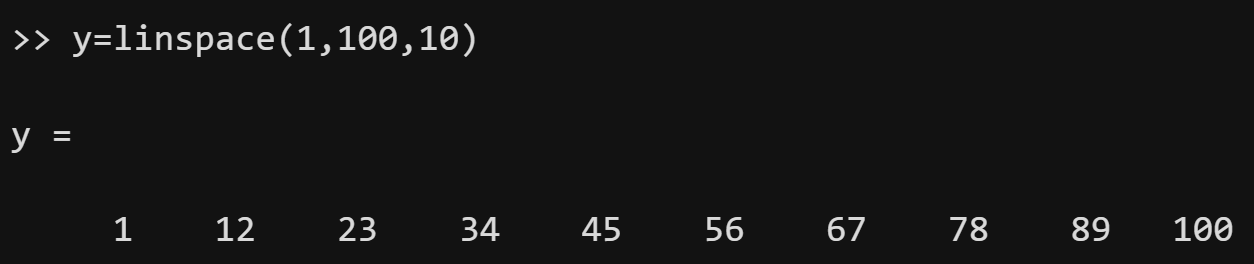 ●linspace(a,b):该命令用来创建一个行向量,向量中的第一个元素为a,最后一个元素为b,形成总数为100个元素的线性间隔的向量。