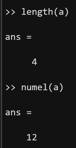 ((length函数和numel函数也可以用在矩阵上。length函数会返回行和列的较大值:对上面的A矩阵,length(A)返回4;numel函数会返回矩阵中元素的总数,numel(A)返回12)