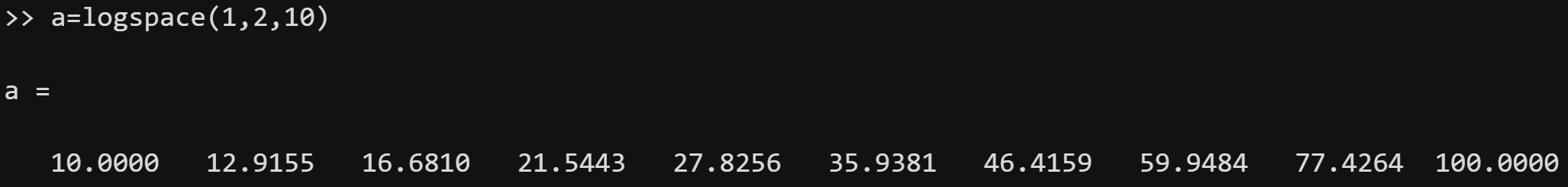 ●logspace(a,b,n):创建一个行向量,其第一个元素为10^a,最后一个元素为10^b,形成总数为n个元素的等比数列向量。