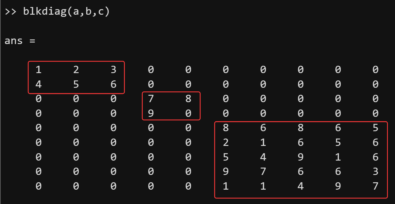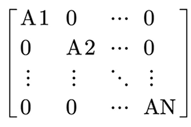 分块对角矩阵是相对于常规的对角矩阵而言的,常规的对角矩阵沿对角线具有单个元素,而分块对角矩阵的对角线的元素是矩阵。我们可采用以下形式表示一个分块对角矩阵: