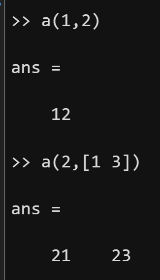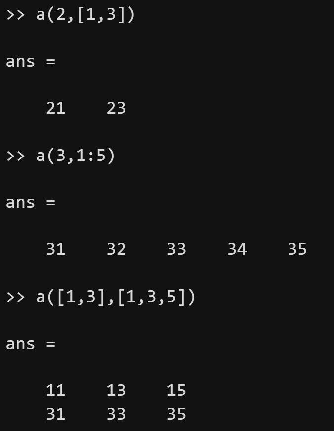 上方给出了一个m行n列的矩阵,对于第i行第j列的元素,我们用aj表示。因此,我们可以使用矩阵元素所处的行(row)和列(column)来进行引用矩阵的某一个元素,方式为:a(row_ind,column_ind).这里的row_ind表示要引用的元素的行索引,column_ind表示列索引。如果row_ind和column_ind都是一个常数,则表示提取矩阵中的单个元素;如果row_ind或column_ind是包含有多个元素的向量,则表示同时提取多个位置的元素。与向量类似,end也可以用来替代最后一个索引,通常和冒号法一起使用。