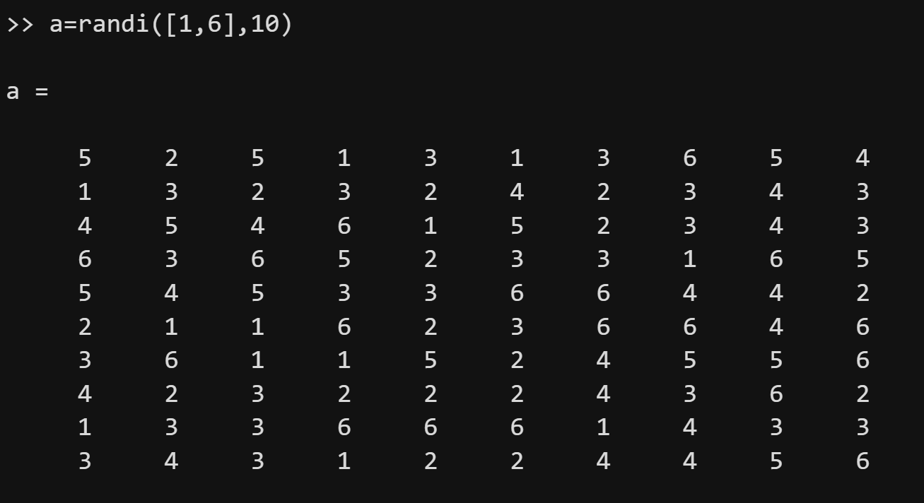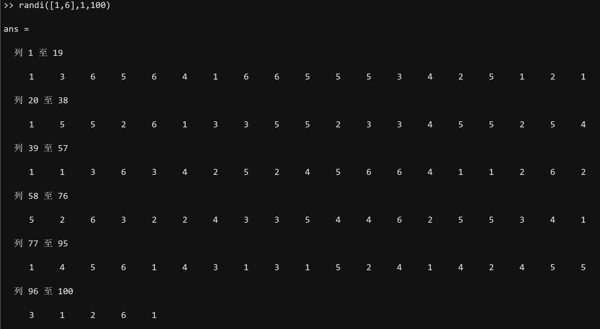 randi函数用来创建均匀分布的随机整数,其最一般的用法为:randi([imin,imax],m,n),该命令可创建一个m行n列的随机数矩阵,随机数矩阵中的每个元素都是从区间[imin,imax]内随机抽取的整数。举个例子,假设我们要模拟投掷100次骰子,骰子有6个面,那么我们可以使用randi([1,6],1,100)得到一个长度为100的行向量,向量中的每个元素都是取自1,2,3,4,5,6。