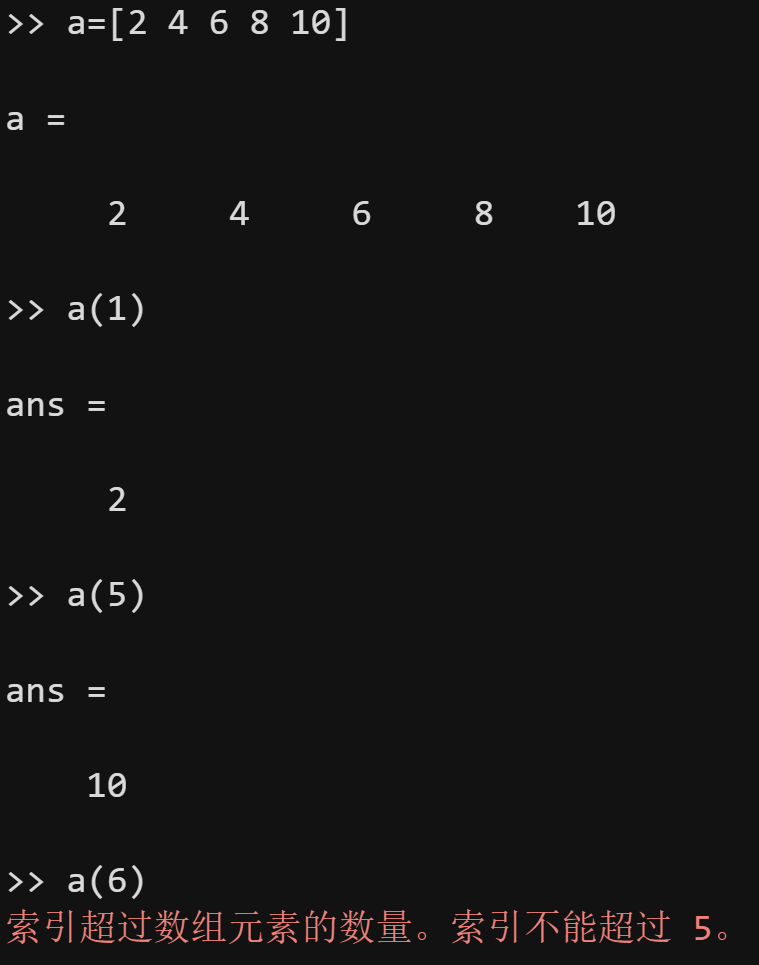MATLAB会报错:"索引超出数组元素的数目(10)",即告诉我们,现在这个向量中元素的数目只有10个,即最大索引是10,而你取了索引11的元素,超出了取值范围。