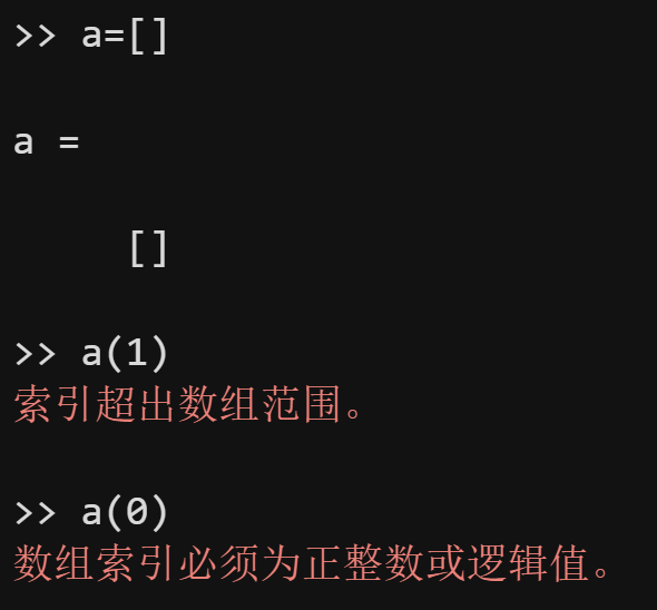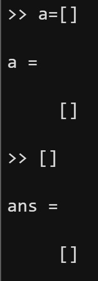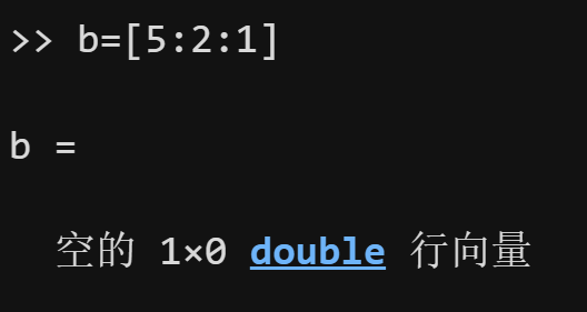 怎么理解这个返回结果呢?这个"1×0"指的是向量的维度,你可以理解为1行0列,即这个向量是空的,不存在元素。在MATLAB中,我们可以直接使用命令[]创建空的向量。