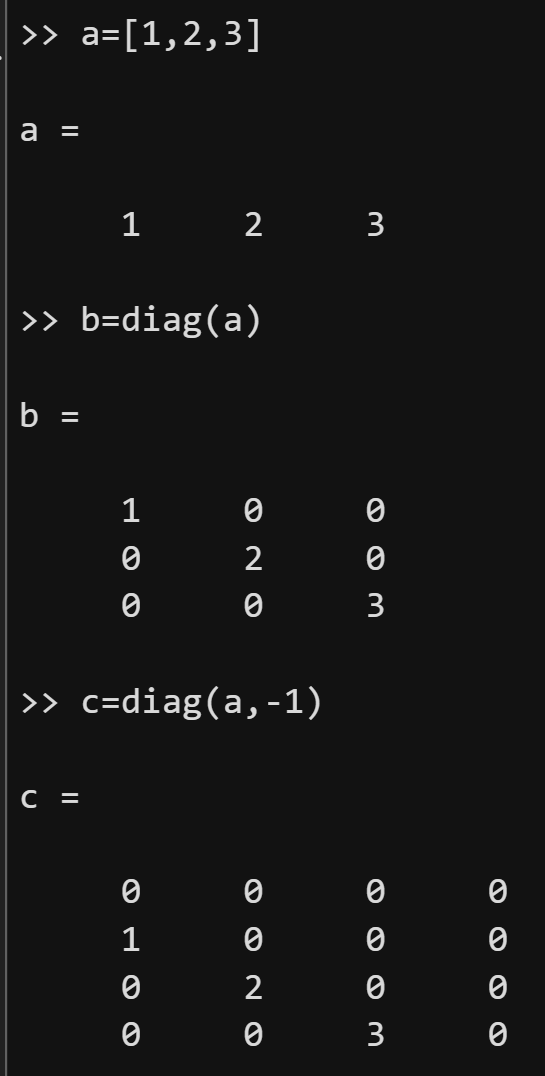 情况1:如果输入的第一个参数是向量,则表示创建对角矩阵。diag(v,k)将向量v的元素放置在第k条对角线上,其他位置元素为0。k=0表示主对角线,k>0位于主对角线上方,k<0位于主对角线下方。如果k=0,可以直接写成diag(v)。