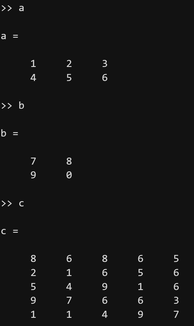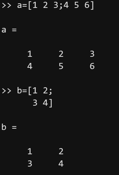 输入矩阵时要以中括号"[]"作为标识符号,矩阵的所有元素必须都在中括号内。矩阵的同行元素之间用空格或逗号分隔,行与行之间用分号或回车键分隔。