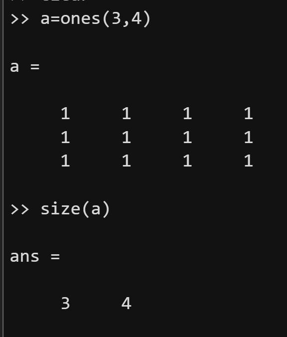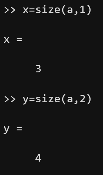 (2)size(A,dim)返回在维度dim上的长度。dim=1时表示行;dim=2时表示列。若A是一个3X4的矩阵,则size(A,1)返回3,size(A,2)返回4。
