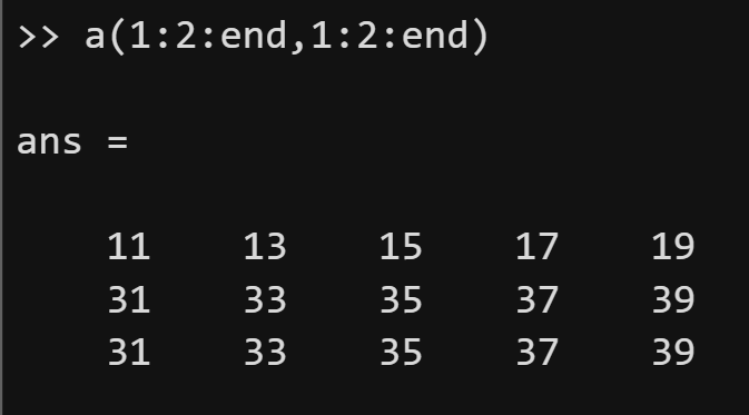 例如,我现在要访问a中第五个至最后一个元素,那么我们可以直接使用a(5:end),这里的end就表示了a的最后一个索引;另外,我们还可以对end进行计算,例如要访问a中第五个至倒数第三个元素,我们可以使用a(5:end-2),得到的结果为[3264128256]。这里有一个易错点,如果使用了end,不能将要取元素的索引赋值给ind。例如,还是要访问a中第五个至最后一个元素,如果你令ind=5:end,MATLAB就会报错。因此,我们只能在a后面的小括号中使用end来替代数组的最后一个索引。那我们回到上面的问题,在不知道a中有多少个元素的前提下,我们可以使用a(1:2:end)最后请大家思考:如何将一个向量倒序?例如原来的向量是[1 5 8 4],倒序后是[4 8 5 1]。