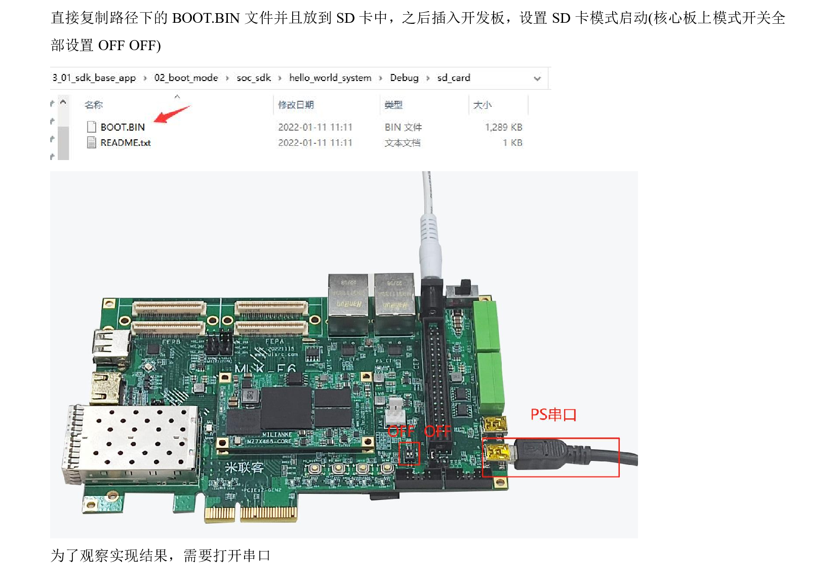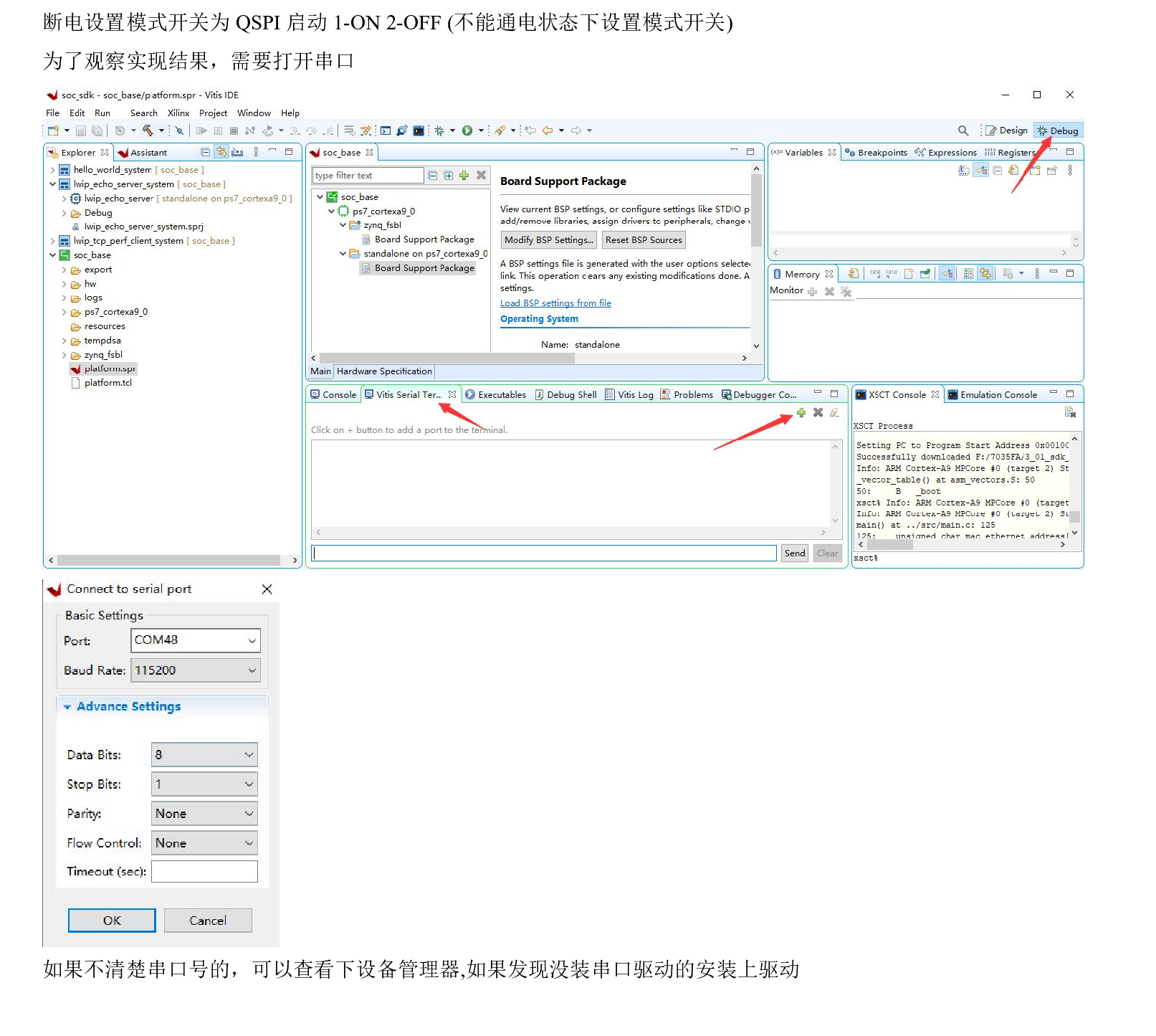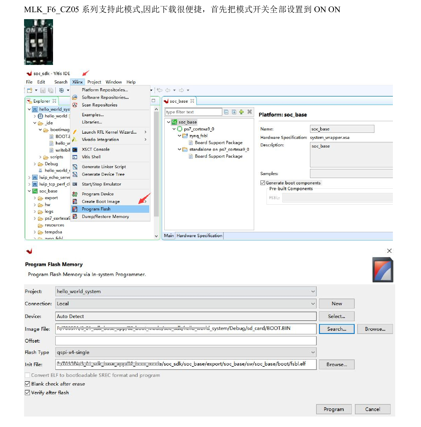 使用SDK完成基本的固化方法甚至不需要掌握ZYNQ的启动原理。只需要正确产生BOOT.BIN文件,正确设置模式开关,掌握烧录流程即可,所以以下关键还是软件的操作流程。