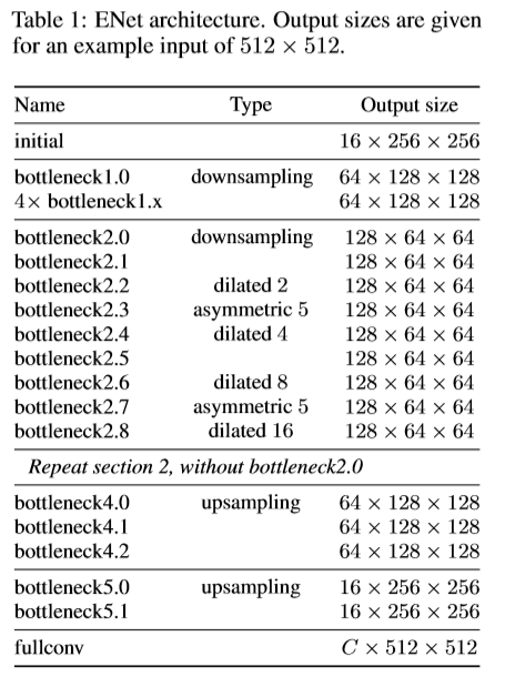 本文选择ENet,其网络结构分别如下: