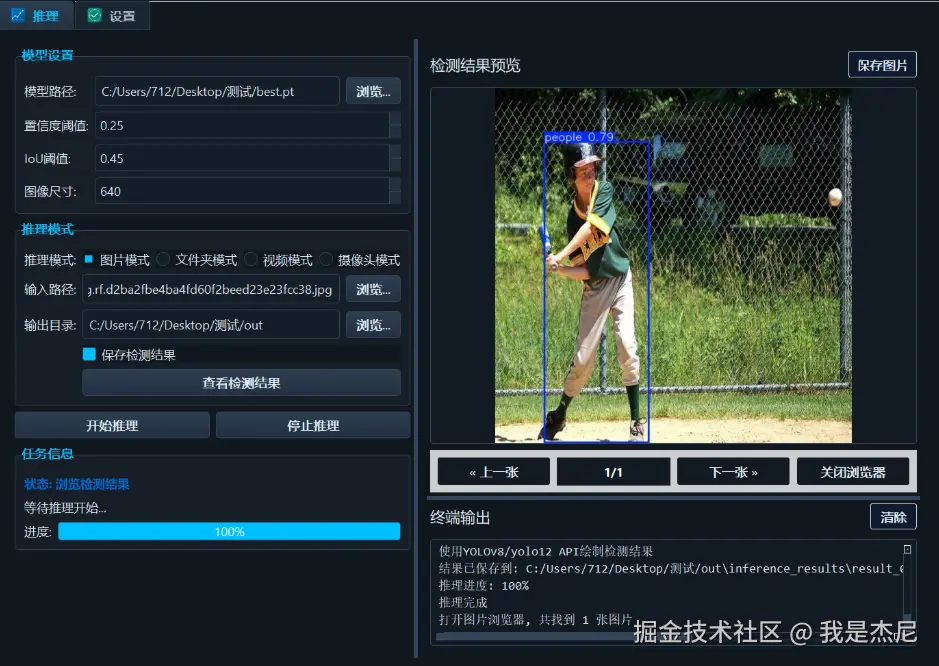 在推理阶段,系统通过 Python 接口加载训练完成的模型,并输出以下信息: