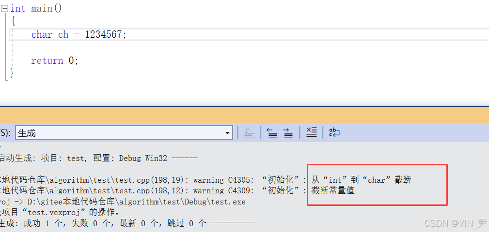 显然,这个值肯定是放不进去的,因为超出范围了,char类型一个字节,范围也是-128~127