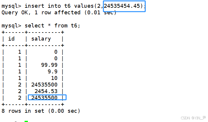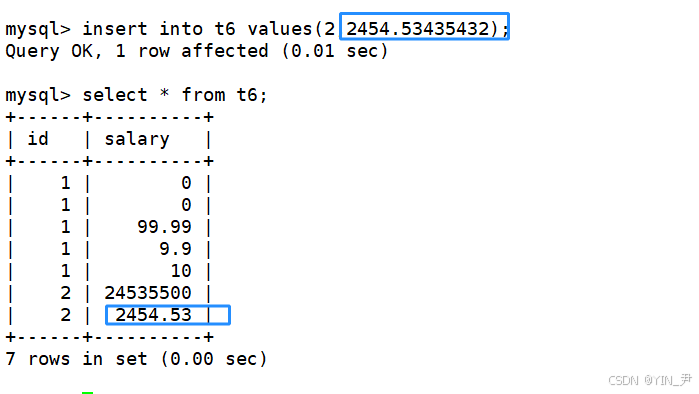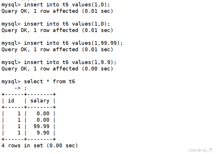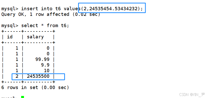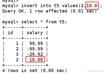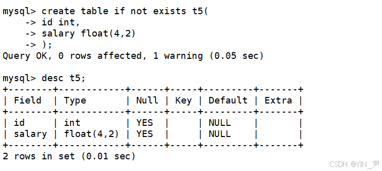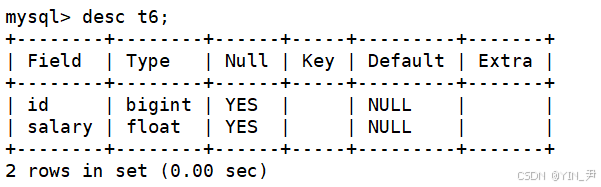 有两列,id代表身份,salary代表薪水,salary的类型为(有符号)float(4,2),就代表总的显示长度为4,小数点后的位数长度为2