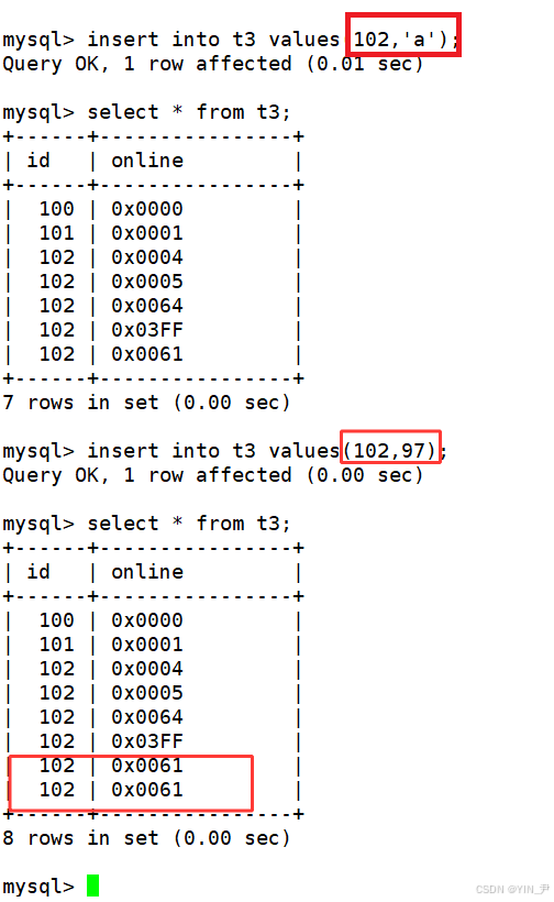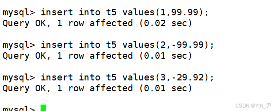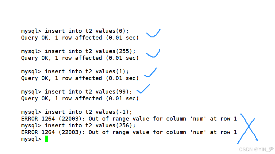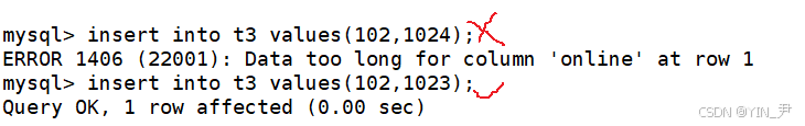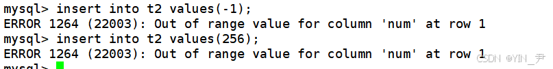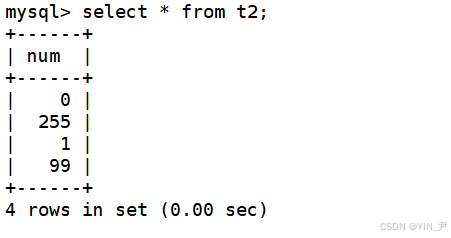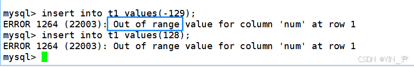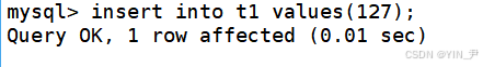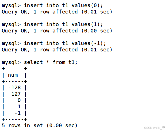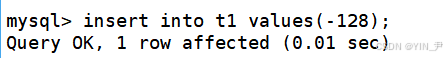 然后来插入一些数据,这里是有符号数,那tinyint一个字节,范围是-128~127