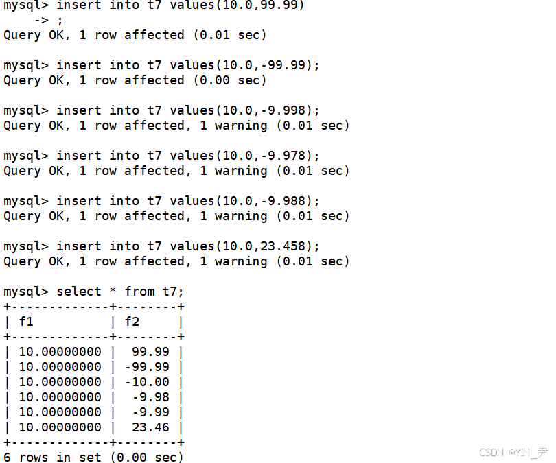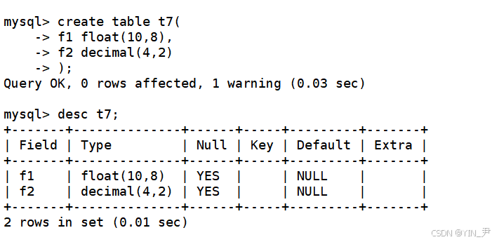 create table t7( f1 float(10,8), f2 decimal(4,2) );