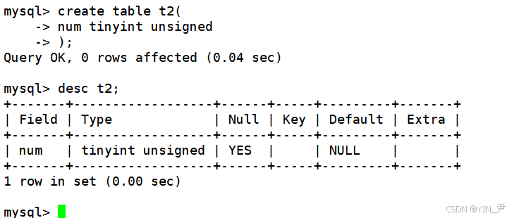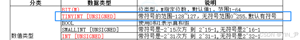 回看上面表格里对tinyint的介绍,使用的时候可以在后面加unsigned ,表明它是无符号数,不加默认为有符号数。