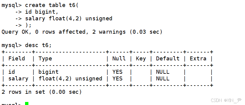 float[(m, d)] [unsigned]//unsigned不带,默认有符号