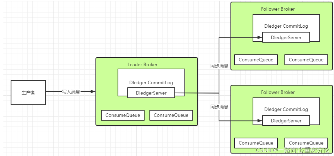Leader Broker上的Dledger收到一条数据后,会标记为uncommitted状态,然后他通过自己的DledgerServer组件把这个uncommitted数据发给Follower Broker的DledgerServer组件。