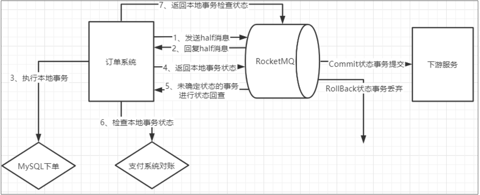 如果下单时,写数据库失败(可能是数据库崩了,需要等一段时间才能恢复)。那我们可以另外找个地方把订单消息先缓存起来(Redis、文本或者其他方式),然后给RocketMQ返回一个UNKNOWN状态。这样RocketMQ就会过一段时间来回查事务状态。我们就可以在回查事务状态时再尝试把订单数据写入数据库,如果数据库这时候已经恢复了,那就能完整正常的下单,再继续后面的业务。这样这个订单的消息就不会因为数据库临时崩了而丢失。
