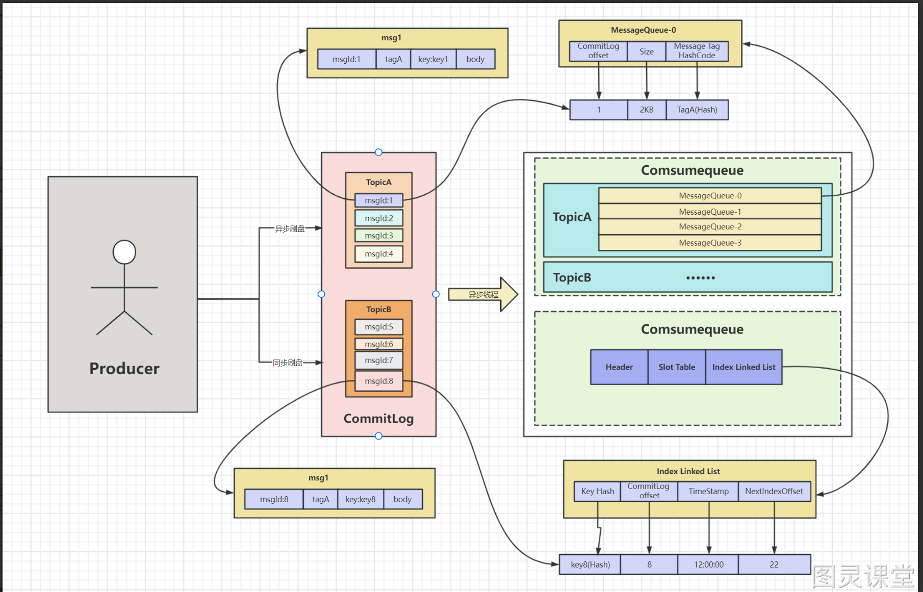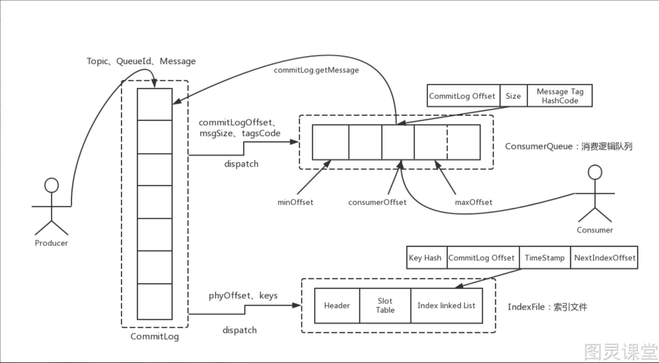 - ConsumeQueue:消息消费的逻辑队列,类似数据库的索引文件。