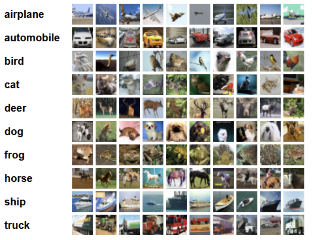 CIFAR-10数据集5万张训练图像、1万张测试图像、10个类别、每个类别有6k个图像,图像大小32×32×3。下图列举了10个类,每一类随机展示了10张图片: