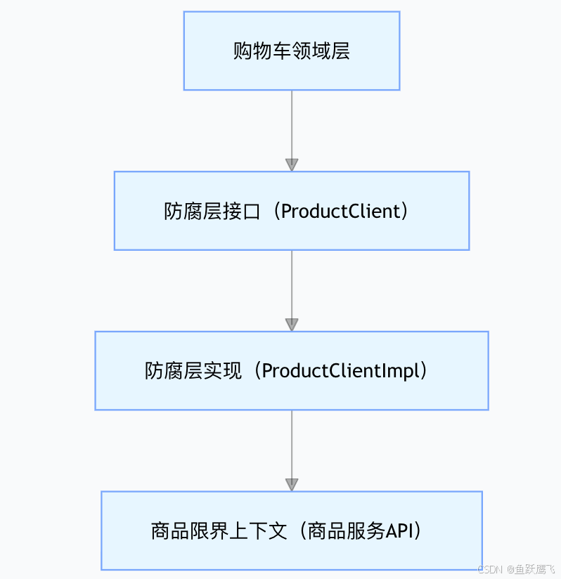 以购物车依赖商品服务为例,防腐层的设计遵循 "接口定义在领域层,实现在基础设施层" 的原则,整体分为 3 层,交互流程清晰: