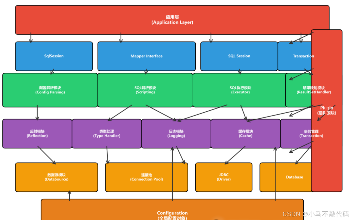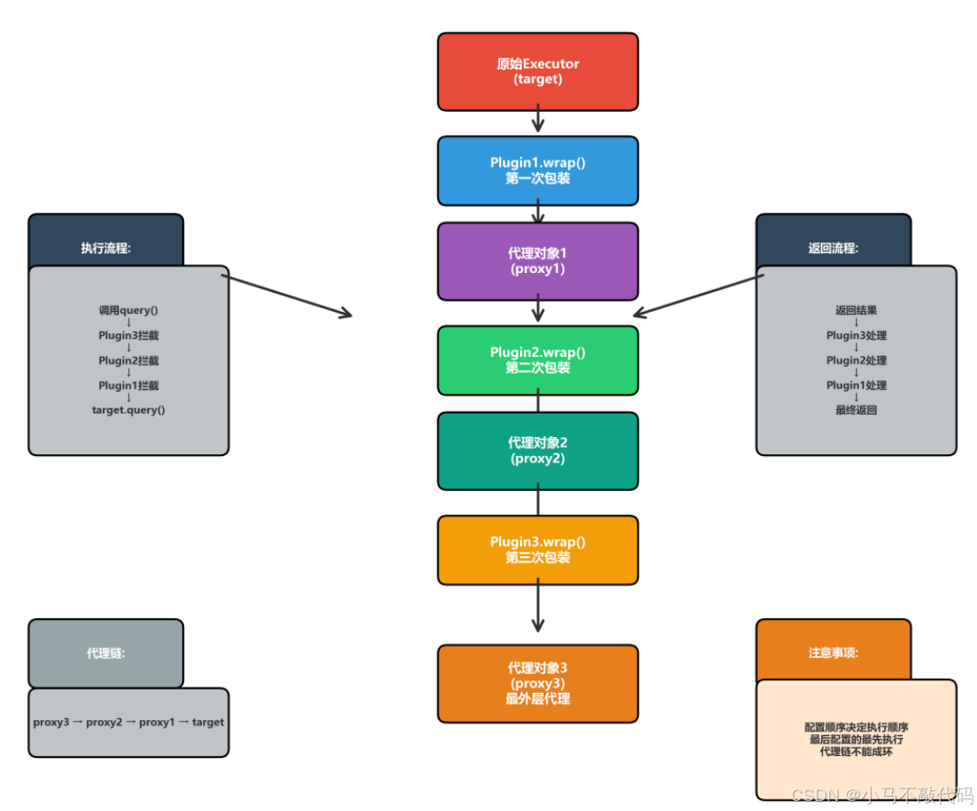 从上图可以看出,MyBatis采用了分层架构设计,而插件模块(Plugin)通过动态代理机制横切整个框架,能够在核心组件的执行过程中插入自定义逻辑。它为MyBatis提供了强大的扩展能力,使得开发者可以在不修改源码的情况下增强框架功能。