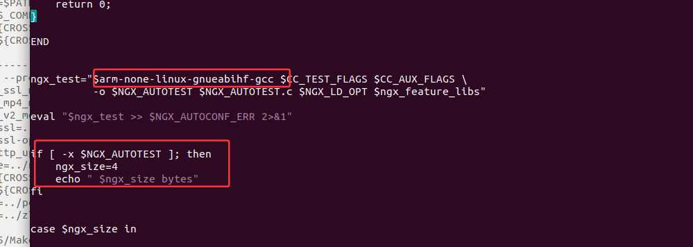 修改完成之后保存退出。接着打开 auto/types/sizeof 文件,将 15 行处的" ngx_size="修改为" ngx_size=4",并且将 36 行处的"$CC"修改为"arm-none-linux-gnueabihf-gcc",如下所示: