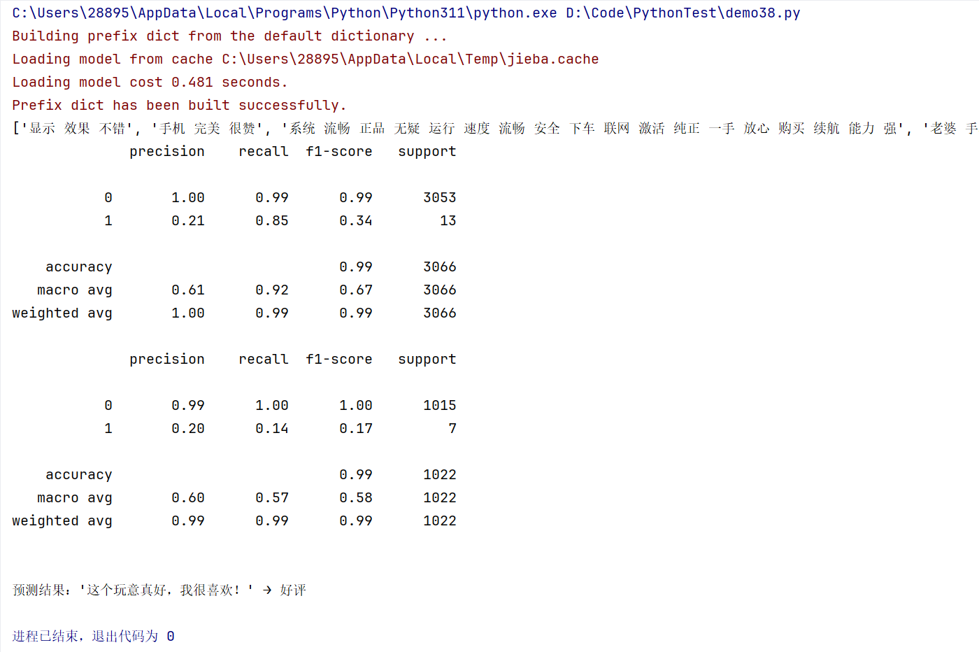 jieba.lcut():结巴分词库的精确模式分词函数,返回分词后的列表iloc[:, 0]:提取DataFrame的第一列数据(假设文本内容在第一列)- 过滤单词语句:通过