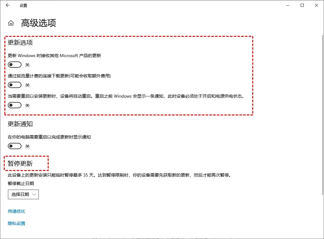 - 在高级选项中,您可以将"更新选项"中项目全部关闭,或者选择"暂停更新",但此暂停更新至多只能暂停35天,达到暂停限制后需先获取新的更新,然后才能再次暂停更新。