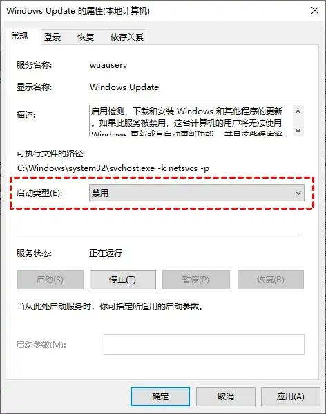 - 在弹出的"Windows Update的属性"对话框中,将"启动类型"设置为"禁用"。