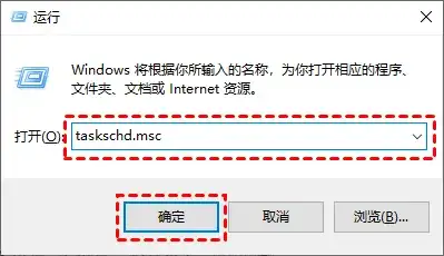 - 按"Windows + R"键,打开运行对话框,并输入"taskschd.msc",然后再单击"确定"。