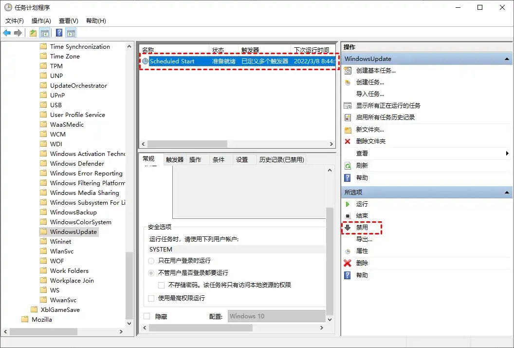 您也可以通过任务计划程序,将"Schedule Start"禁用,以实现Win10自动更新的关闭。
